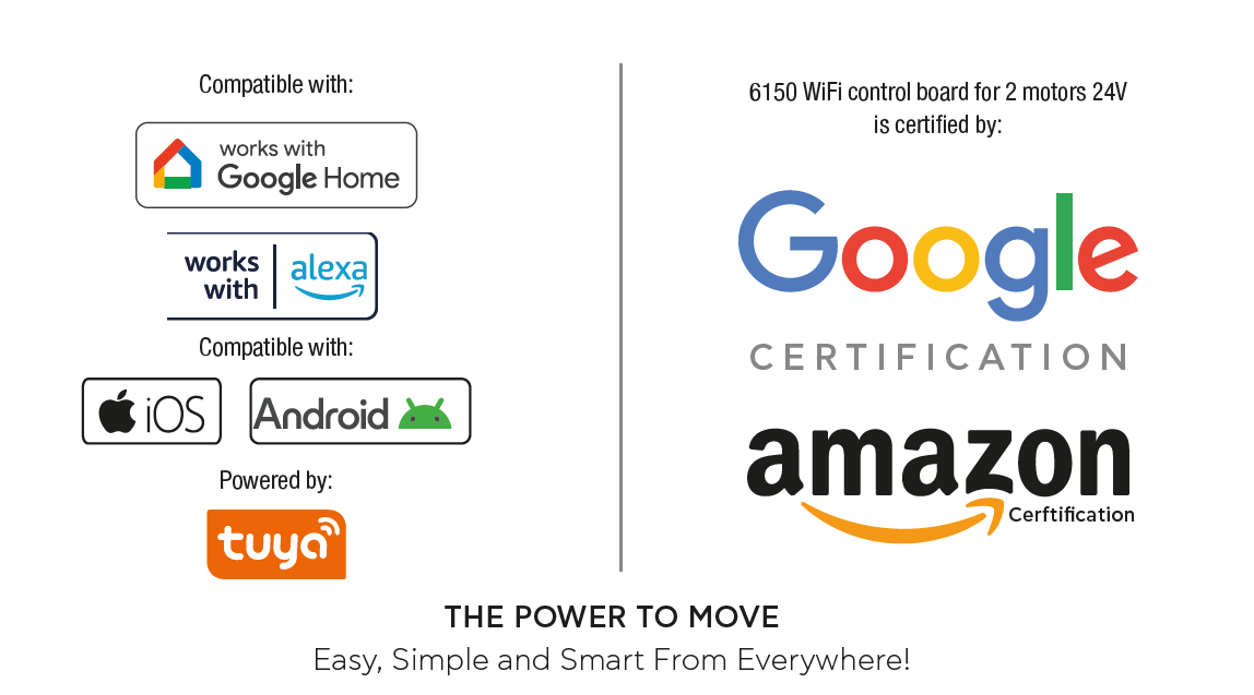 6150 control board is the ideal connectivity solution for double motors 24V that makes access smarter and easier. The user has the possibility to make all the settings of the automation via his mobile phone and also to manage his gate from wherever he is, using the WiFi network, 2.4GHz and 5GHz.